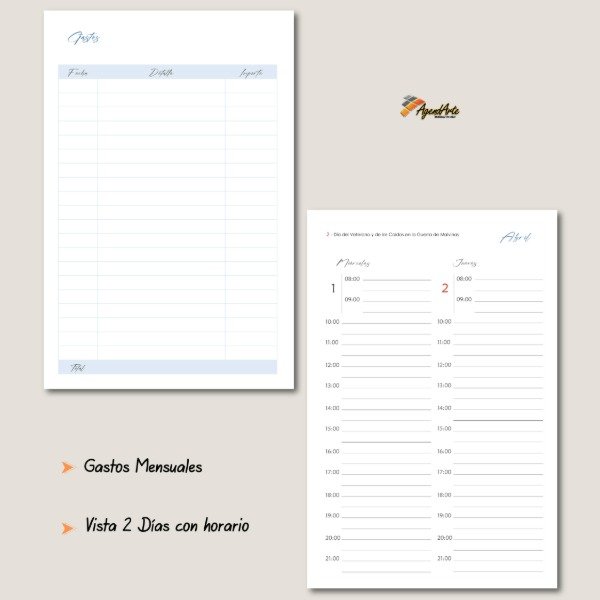 • Vista 2 días por hoja con horarios de 8 a 21 hs (ideal turnos)