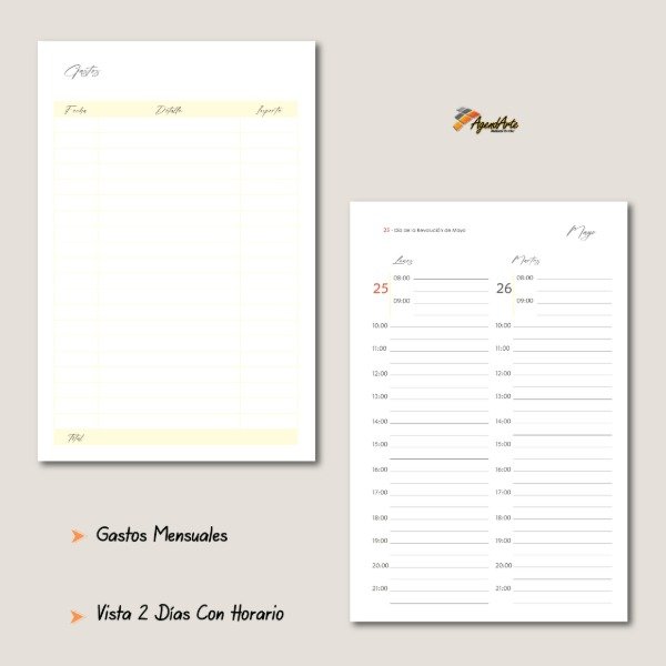 • Vista 2 días por hoja con horarios de 8 a 21 hs (ideal turnos)