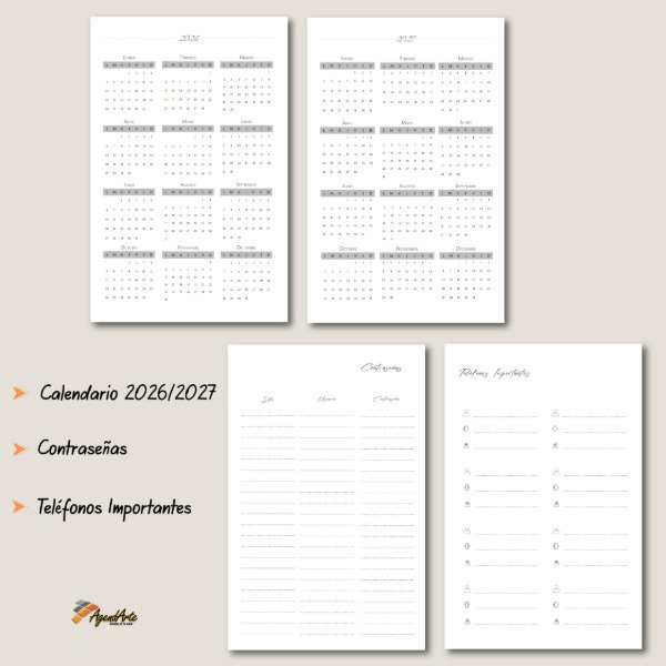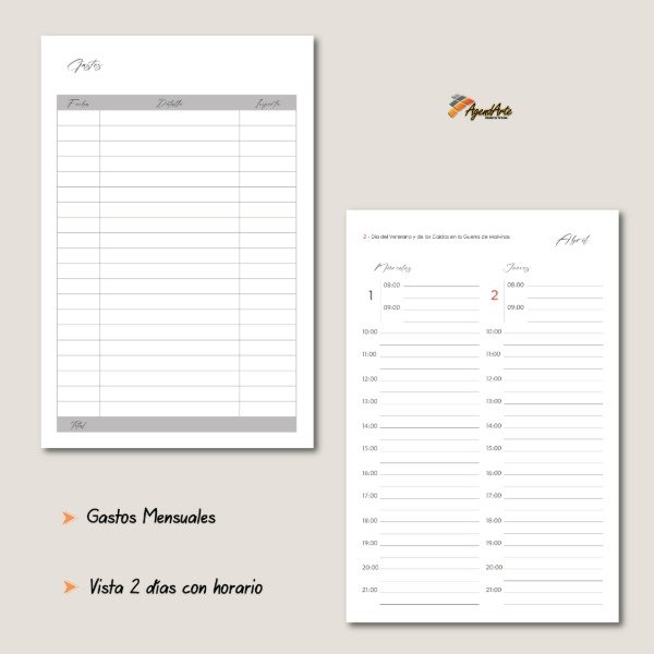 • Vista 2 días por hoja con horarios de 8 a 21 hs (ideal turnos)