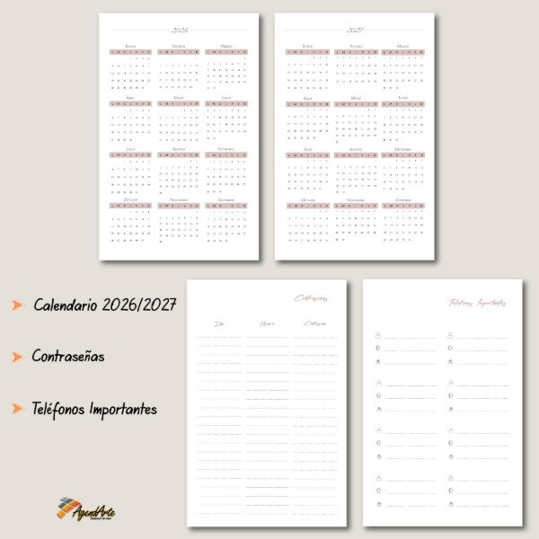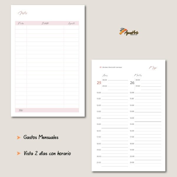 • Vista 2 días por hoja con horarios de 8 a 21 hs (ideal turnos)